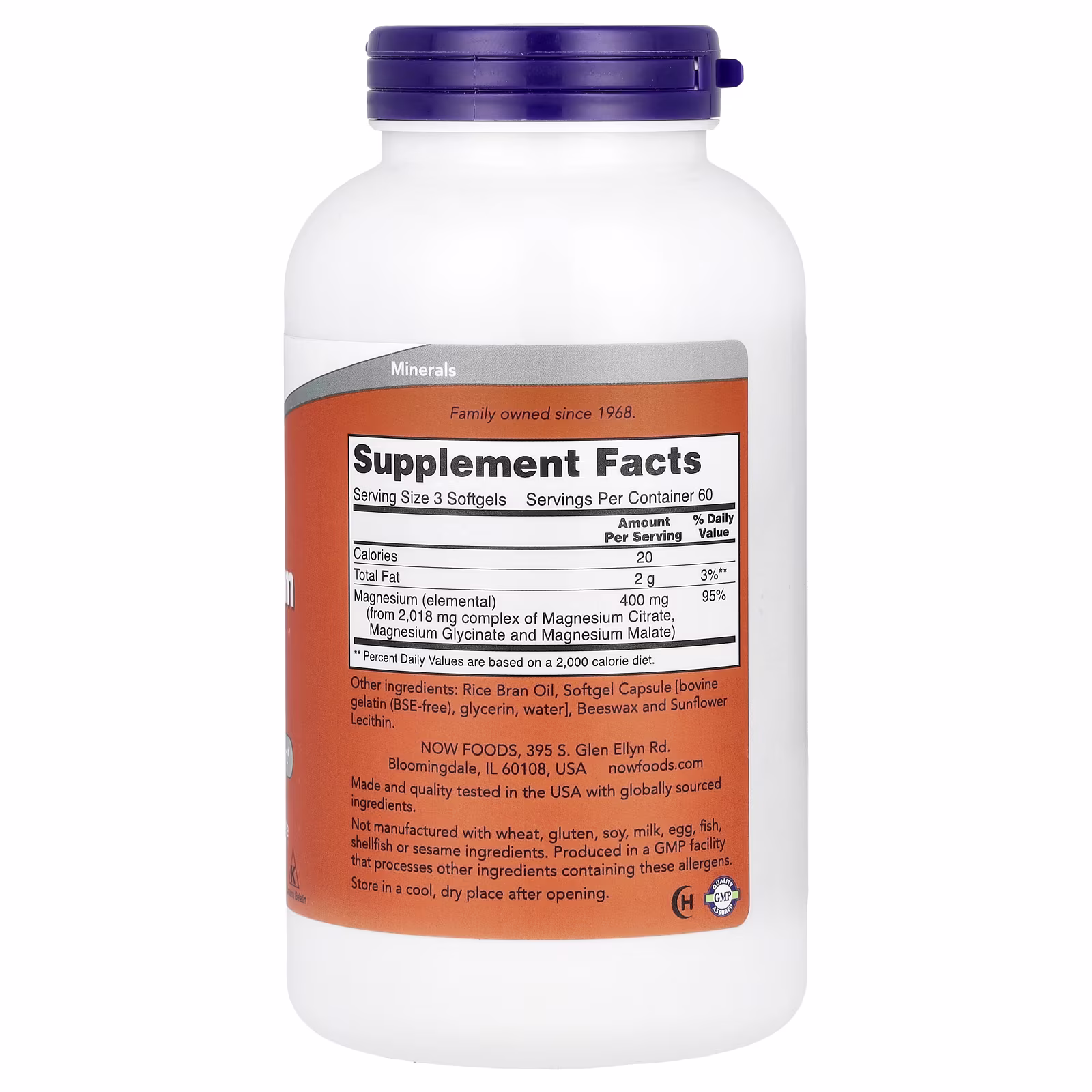El magnesio es un mineral fundamental para la producción y el metabolismo de energía, la contracción muscular, la transmisión de impulsos nerviosos y la mineralización ósea. Es un cofactor necesario para unas 300 enzimas. Entre las reacciones que catalizan estas enzimas se encuentran la síntesis de ácidos grasos, la síntesis de proteínas y el metabolismo de la glucosa. El estado del magnesio también es importante para regular el equilibrio del calcio a través de sus efectos sobre la glándula paratiroidea. El citrato de magnesio se absorbe con facilidad y las Cápsulas blandas de citrato de magnesio de NOW® se proporcionan en una base líquida con formas queladas para lograr una biodisponibilidad superior.