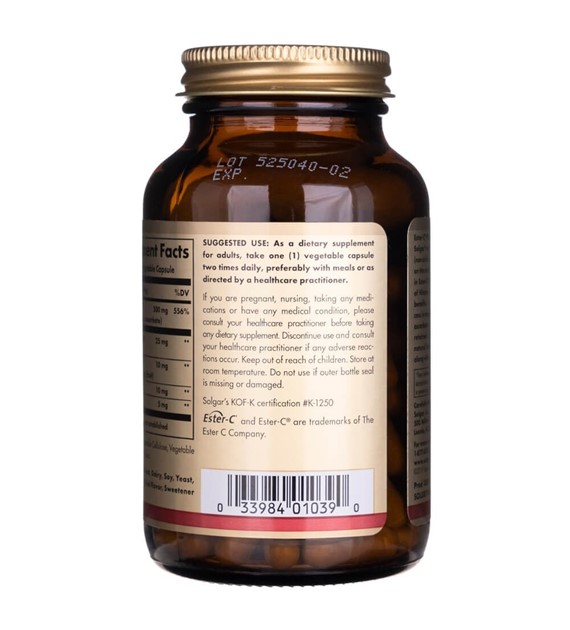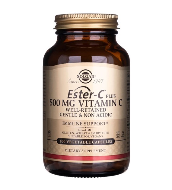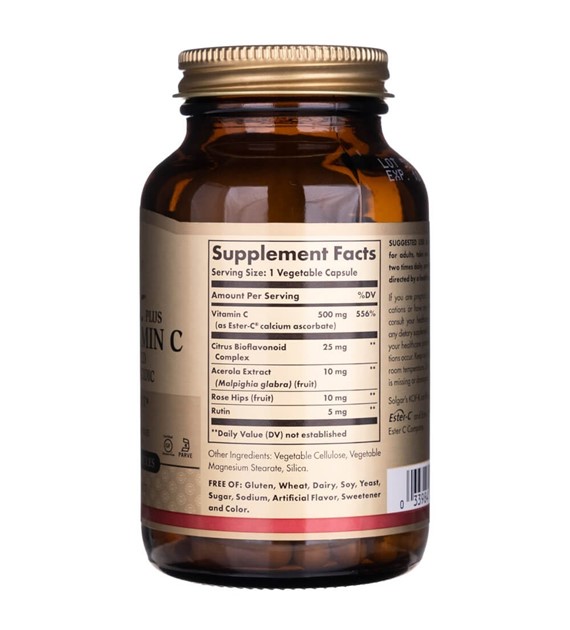 Ester-C Plus 500 mg Vitamina C de Solgar es un suplemento dietético en forma de cápsulas vegetales que contiene una fuente altamente biodisponible y no ácida de vitamina C y bioflavonoides.