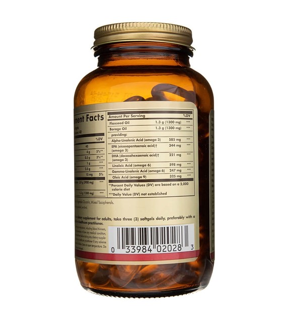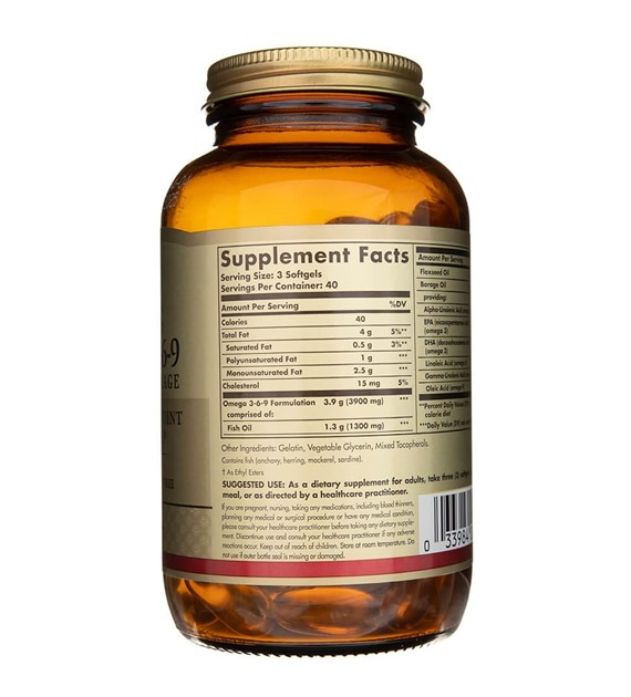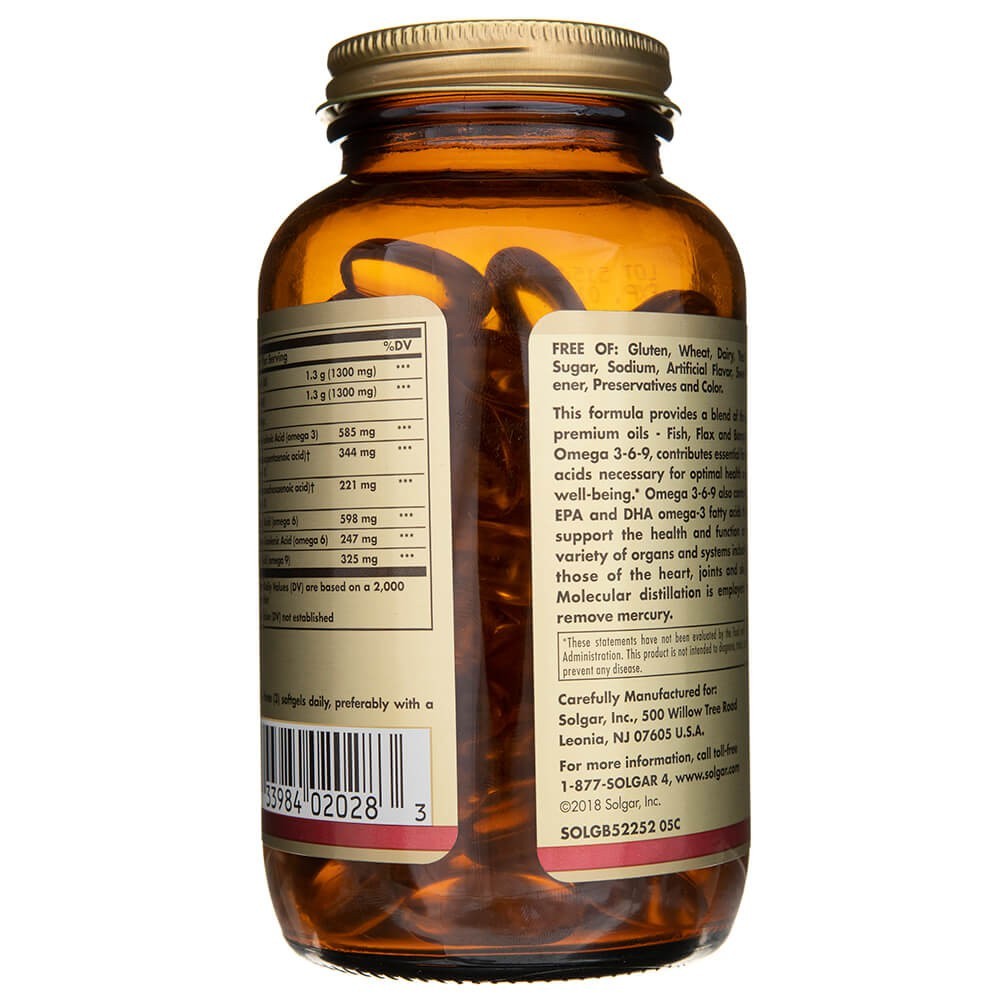 Solgar Omega 3-6-9 Pescado Lino y Borraja 60 perlas es un complemento alimenticio que combina ácidos grasos omega 3, omega 6 y omega 9 procedentes de aceite de pescado, lino y borraja, destilados para eliminar el mercurio, y otros contaminantes.